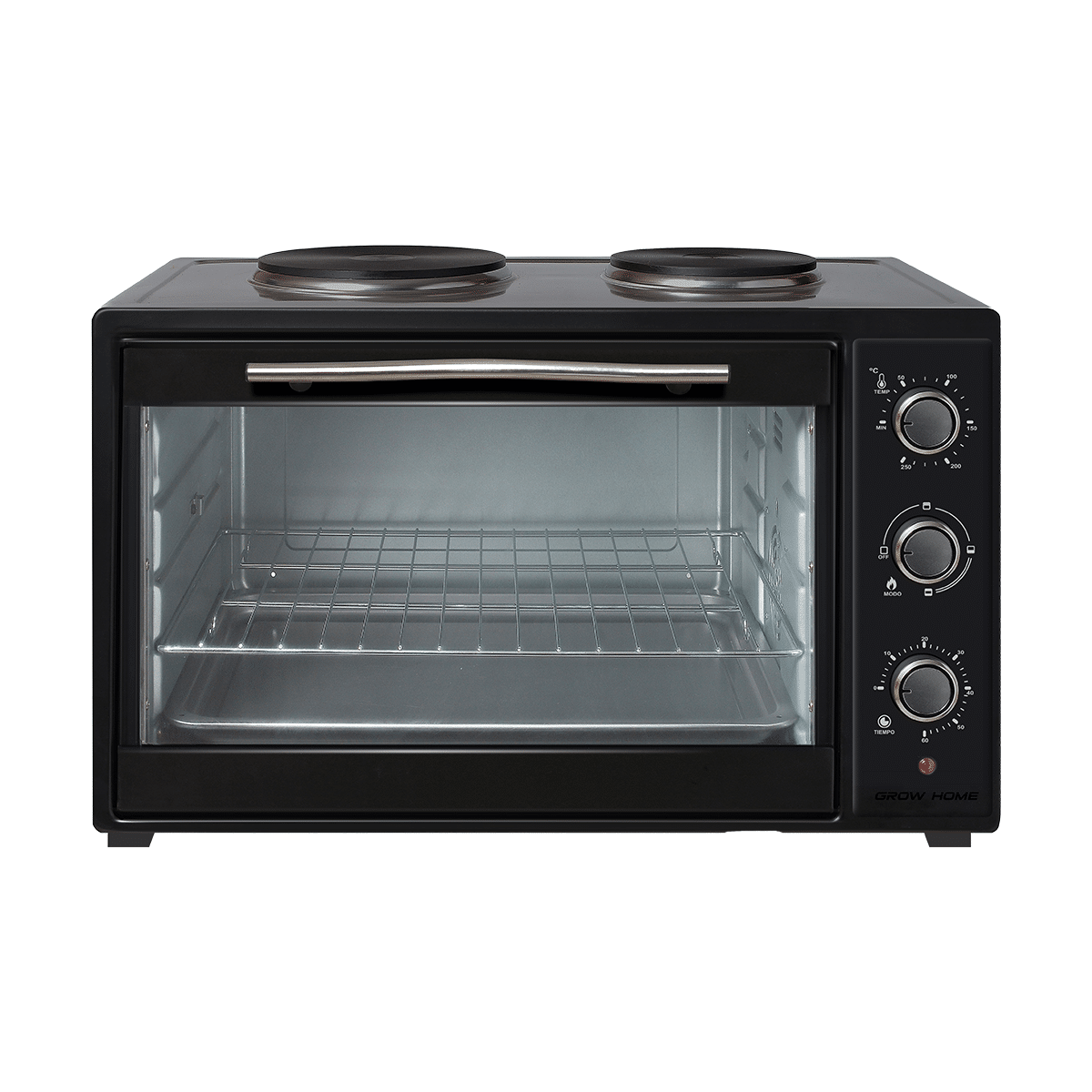 Este modelo dispone de dos hornallas superiores de 700 W y 1200 W que permiten utilizar ollas o sartenes directamente sobre el equipo. También incluye sistema de convección forzada para distribuir el calor de forma más uniforme, luz interior, indicador luminoso exterior de encendido y manija para extraer la bandeja.